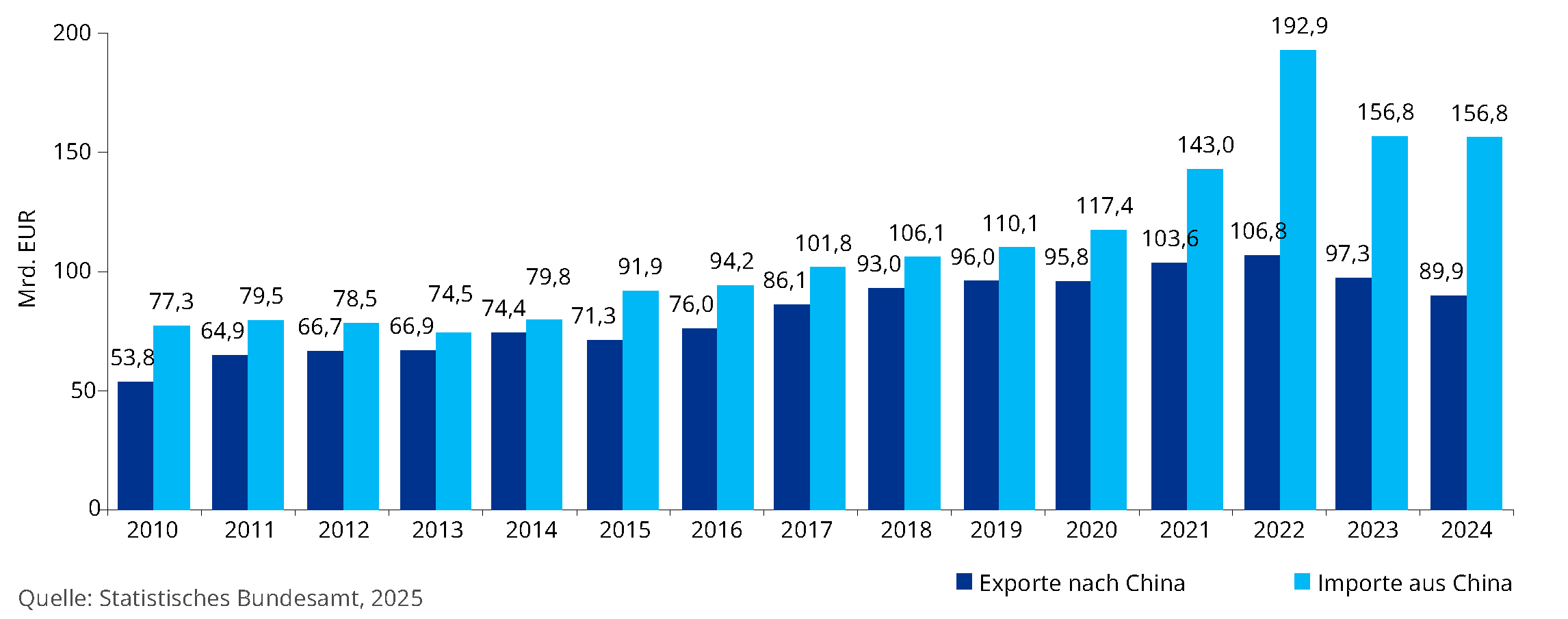 Die Importe aus China stiegen zwischen 2010 und 2022 kontinuierlich an, ehe sie 2023 deutlich zurückgingen. Ursächlich hierfür waren 2023 gefallene Importpreise nach dem Preisboom 2022, der schwache lokale Konsum in Deutschland und ganz besonders die Diversifizierungsstrategie der deutschen Industrie, die vermehrt von Lieferanten außerhalb Chinas bezogen hat. 2024 blieben sie mit 156,8 Milliarden Euro jedoch praktisch unverändert, sodass der Rückgang aus dem Jahr 2023 keine Trendwende markiert. Für 2025 erwartet GTAI einen erneuten Anstieg der Importe.