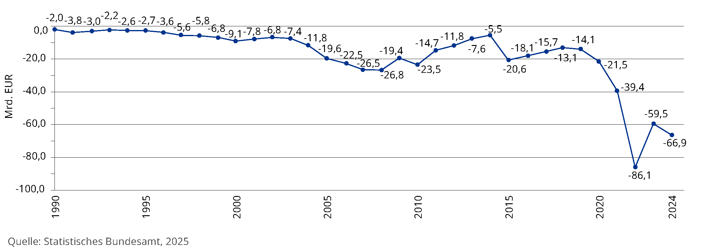 Von 2020 auf 2021 hatte sich das Defizit von circa 20 auf knapp 40 Milliarden Euro nahezu verdoppelt, von 2020 auf 2022 sogar vervierfacht. Zwar deutete 2023 zunächst eine Entspannung an, doch mittlerweile ist klar: Der Rückgang war lediglich eine temporäre Delle im Trend einer strukturellen Schieflage.