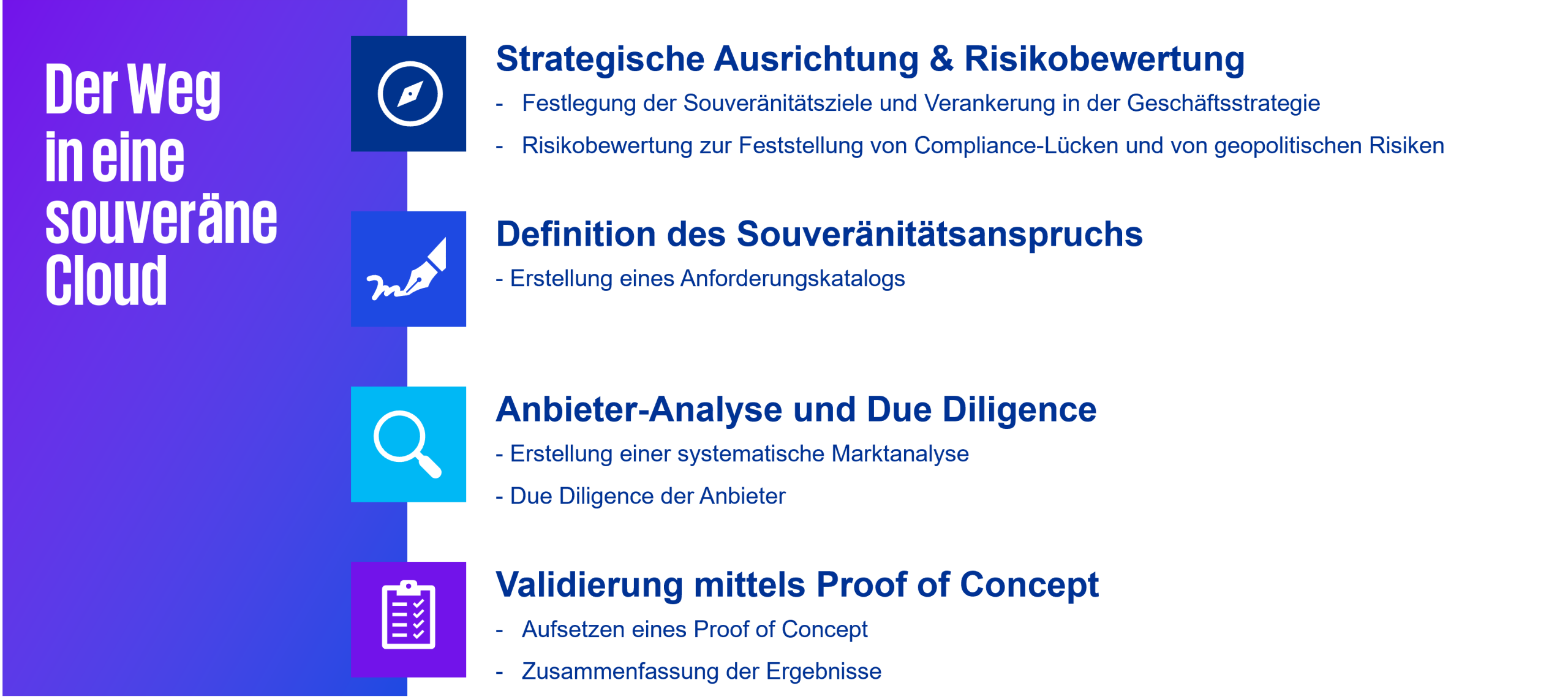 Digitale Souveränität im Finanzsektor ist möglich und vielfach nötig. Sie ist eine konkrete strategische Handlungsoption und gestaltbar. Die Umsetzung einer Strategie für eine souveräne Cloud erfordert nach unserem Ermessen ein Vorgehen in vier Schritten:
