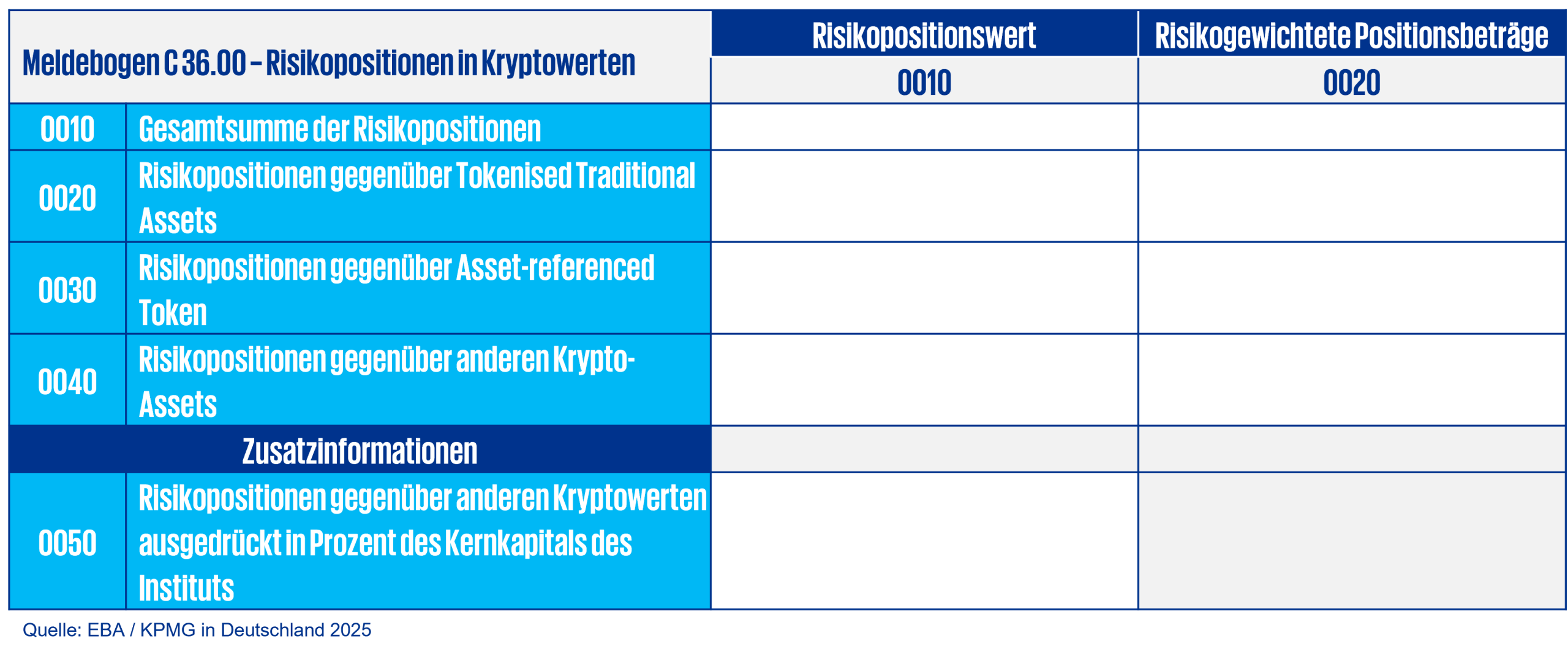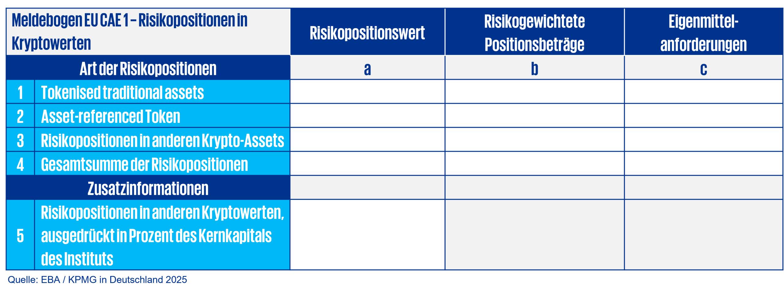 Die Inhalte der Eigenmittelmeldungen werden künftig direkt in die überarbeitete Säule III „Data Hub Offenlegung“ integriert.. Somit müssen betroffene Institute bestimmte Informationen zu ihren Risikopositionen in Krypto-Assets offenlegen.