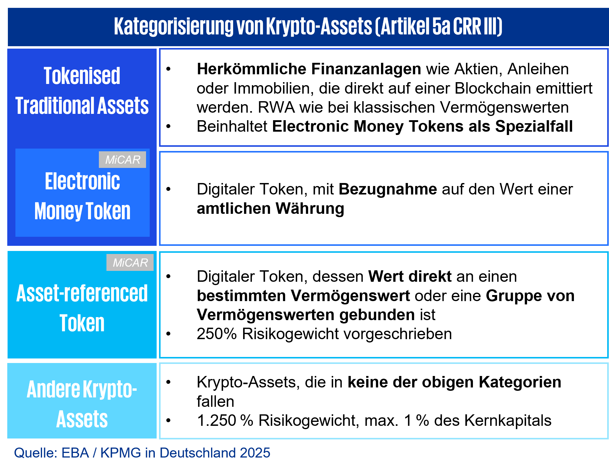 Der finale RTS-Entwurf präzisiert die Eigenkapitalbehandlung der Risikopositionen gegenüber Asset-referenced Token und anderen Krypto-Assets. Die Tokenised Traditional Assets werden wie traditionelle Vermögenswerte gemäß der CRR behandelt und deshalb nicht in dem RTS berücksichtigt. Im Folgenden werden die wesentlichen Vorgaben und neuesten Änderungen des RTS zusammengefasst:
