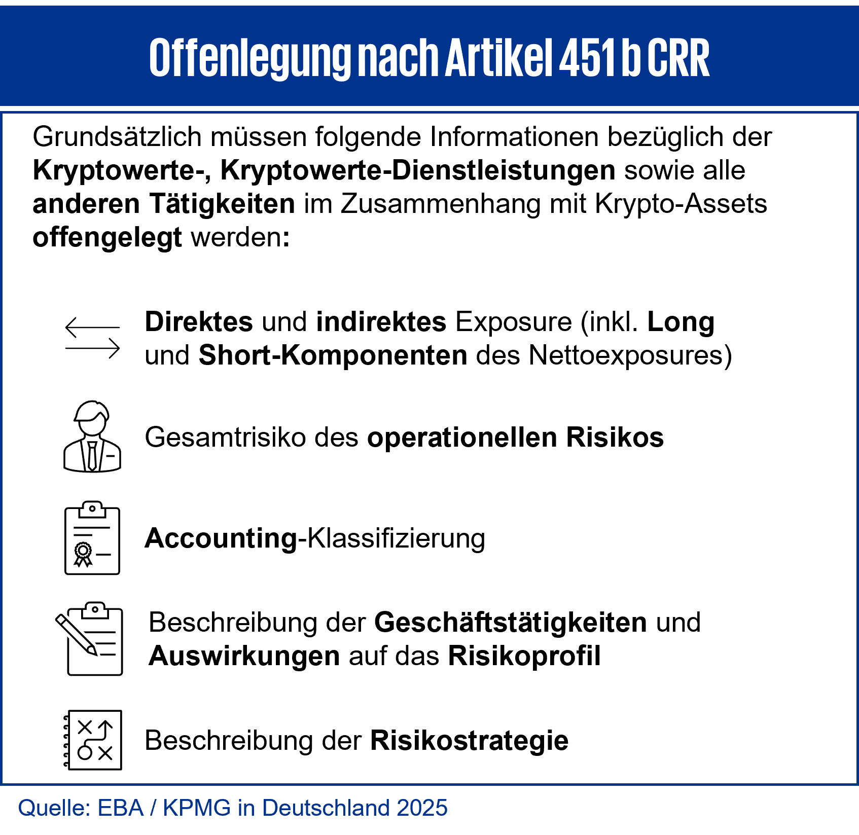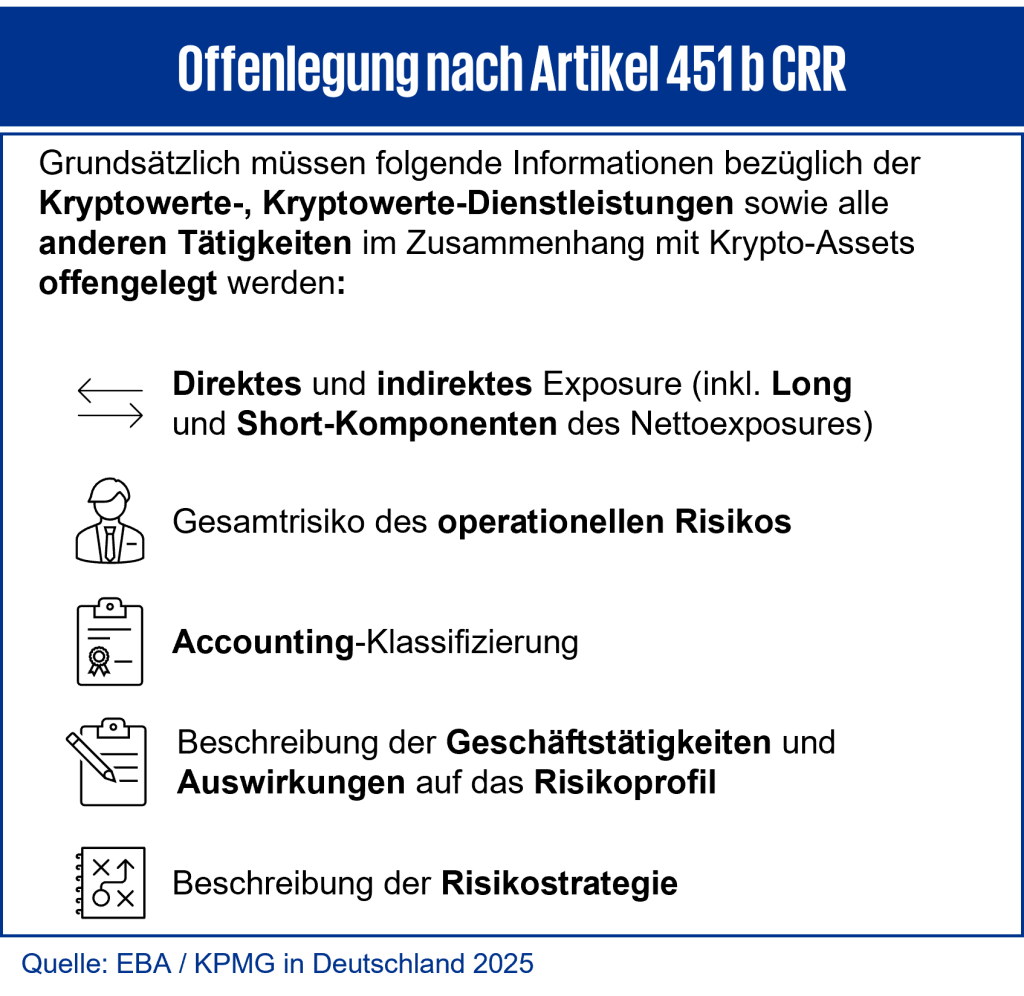 Dabei sind neben der Darstellung von direkten und indirekten Engagements in Krypto Assets auch der Gesamtrisikobetrag für das operationelle Risiko, die Klassifizierung in der Rechnungslegung sowie die Beschreibung der Geschäftstätigkeiten im Zusammenhang mit Krypto Assets anzugeben. Ergänzend ist eine spezifische Darstellung der Risikomanagementstrategie erforderlich.