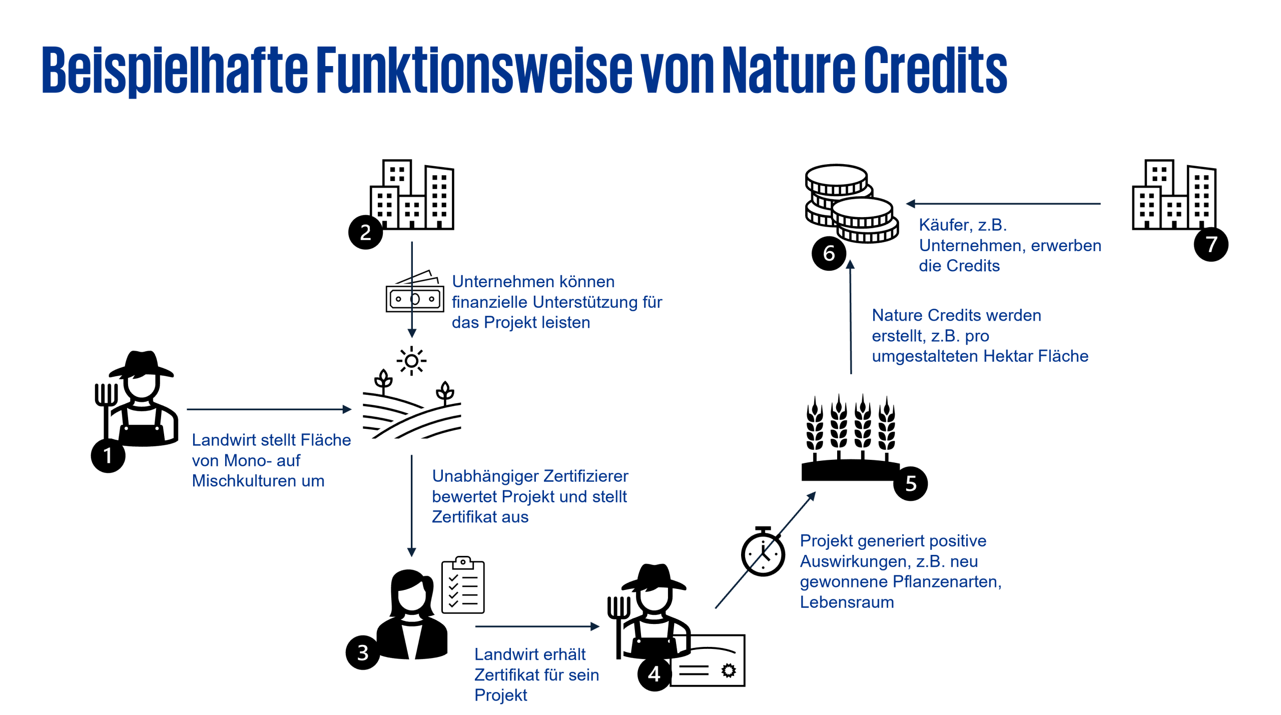 Nature Credits sind freiwillige Instrumente, die den Schutz und die Förderung der Natur finanziell unterstützen. In einem Nature Credits System wird die erbrachte Wirkung von Naturschutzmaßnahmen zunächst quantifiziert und dann handelbar gemacht.