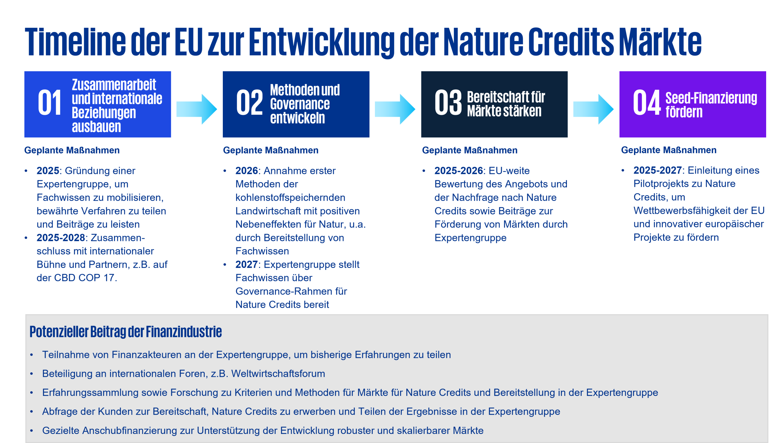 Mit der im Juli 2025 veröffentlichten „Nature Credits Roadmap“ legt die EU-Kommission einen mehrstufigen Zeitplan für die mittelfristige Ausgestaltung eines Nature Credits Marktes in Europa vor. Darin enthalten sind Maßnahmen für die Jahre 2025-2027, die die Kommission zur Marktentwicklung ergreifen möchte. Ein kooperativer Prozess und die enge Zusammenarbeit mit Mitgliedsstaaten, Interessensträgern und internationalen Partnern, der auf den Grundsätzen hoher Integrität, Transparenz und wissenschaftlich fundierten Beiträgen beruht, ist dabei entscheidend.