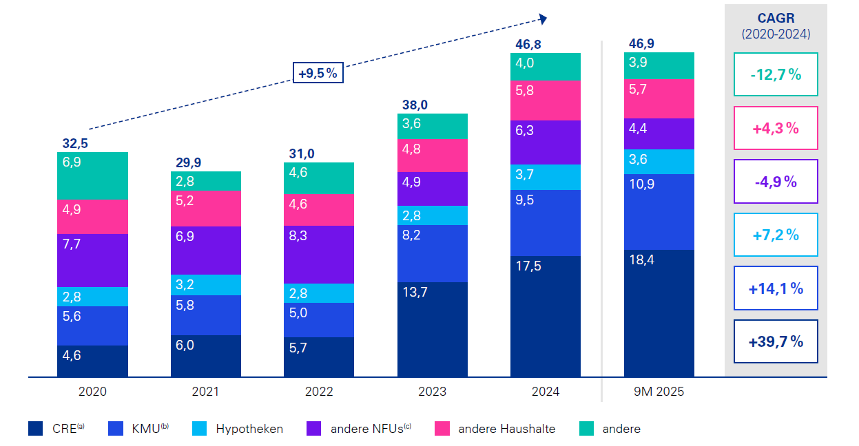 Deutsches NPL-Volumen – nach Segmenten (Mrd. €, 2020–9M 2025)