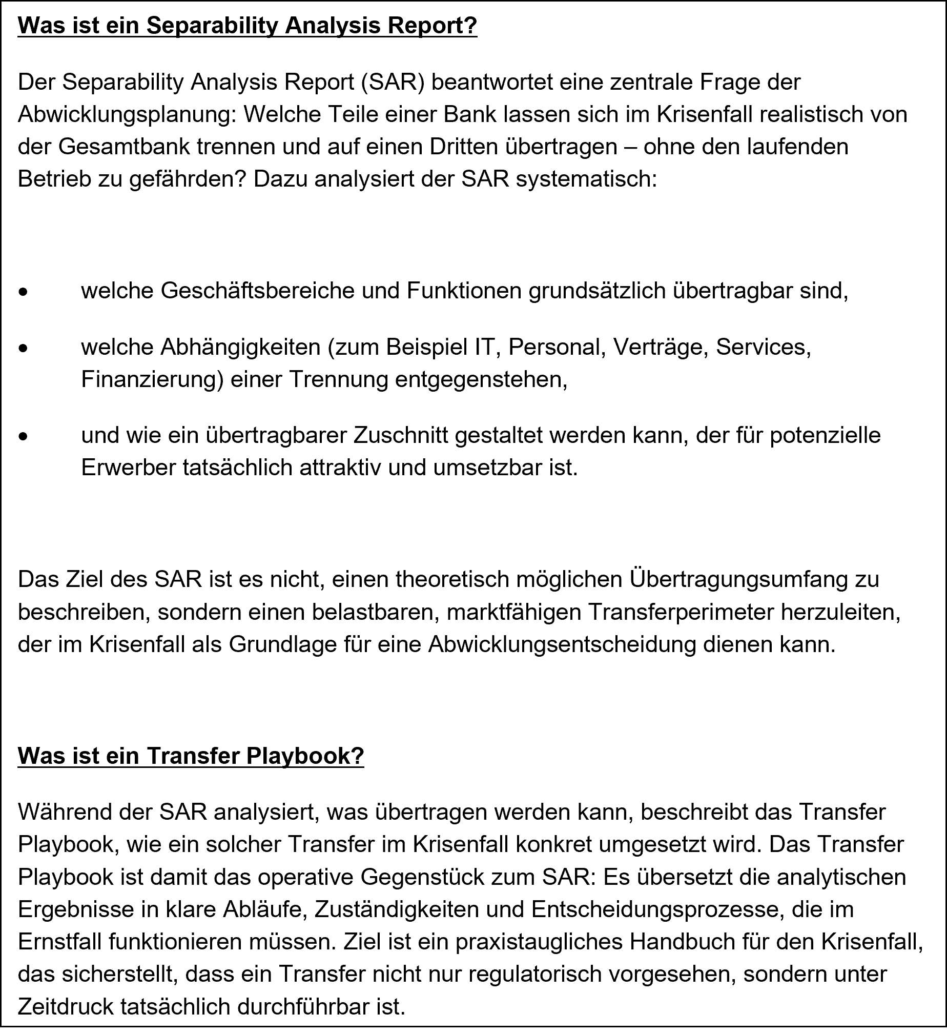 Während der SAR die analytischen Grundlagen liefert, verlangt das Transfer Playbook die operative Übersetzung in belastbare Abläufe entlang der Abwicklungsphasen. Die neuen SRB-Leitlinien definieren erstmals einen konkreten Rahmen, in dem Governance, Rollen, Verantwortlichkeiten, Zeitabläufe, Kommunikationspfade, Entscheidungsprozesse und operative Handlungssequenzen dargestellt und testfähig aufgebaut sein müssen.